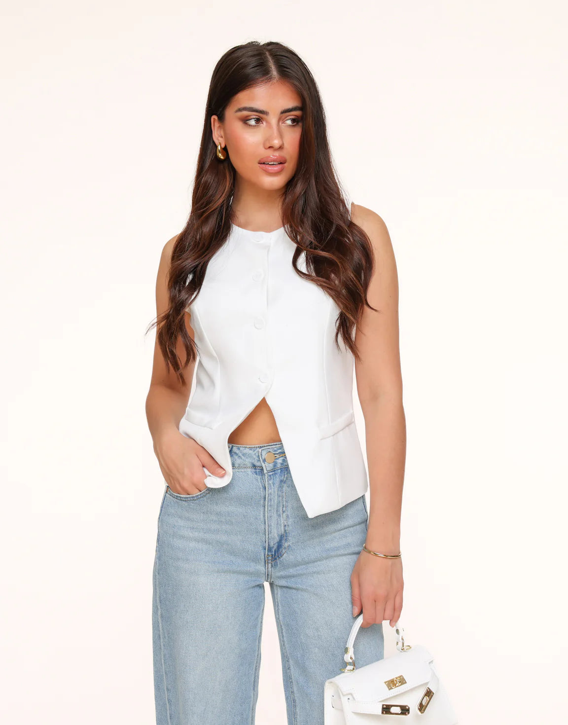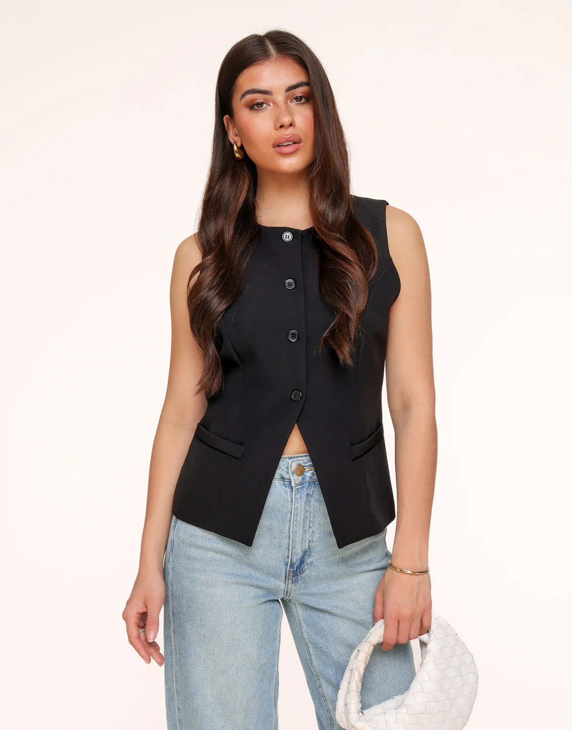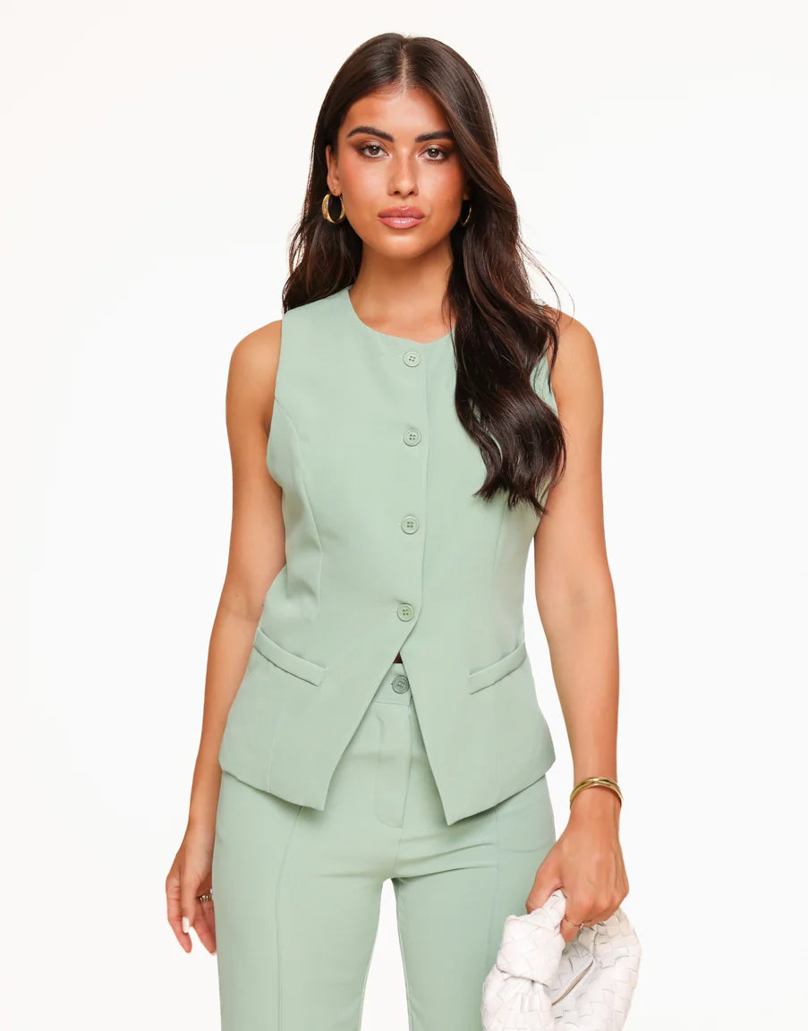 - Details: High-button waistcoat / round neck / button closure / two fake pockets at the front