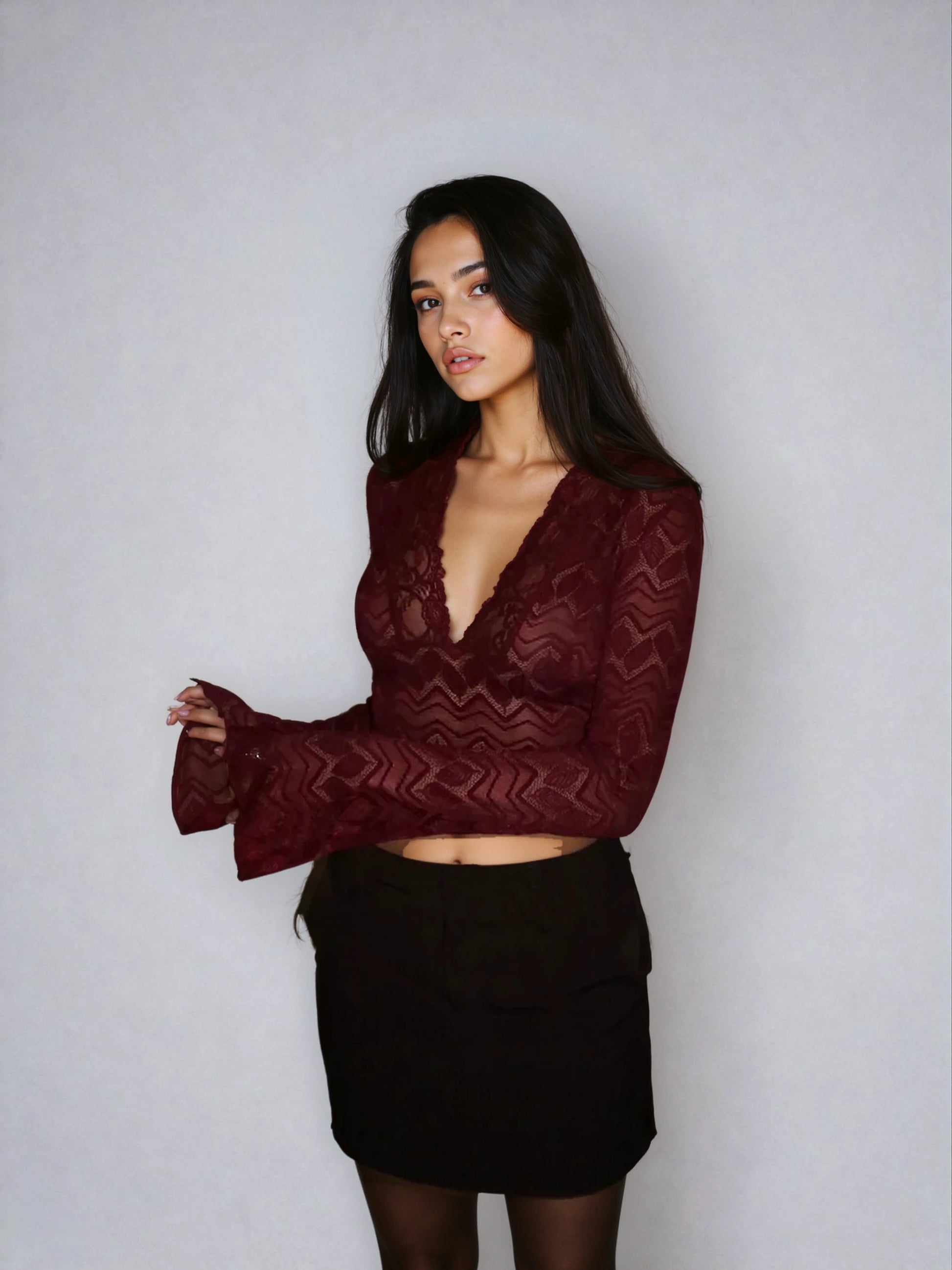 Add a touch of sophistication to your wardrobe with this beautiful lace top. The plunging V-neck and subtle mix of patterns create an elegant, feminine look. Perfect for both casual and formal occasions, you'll always make a stylish impression.