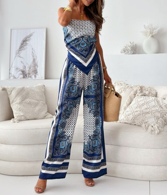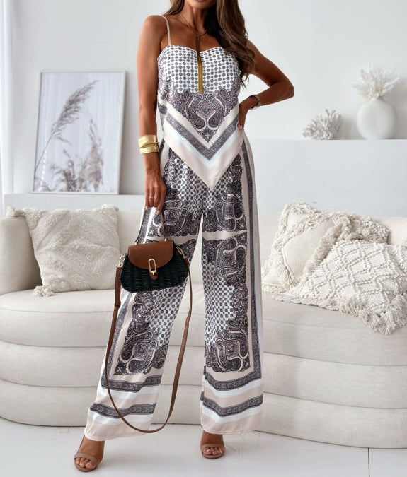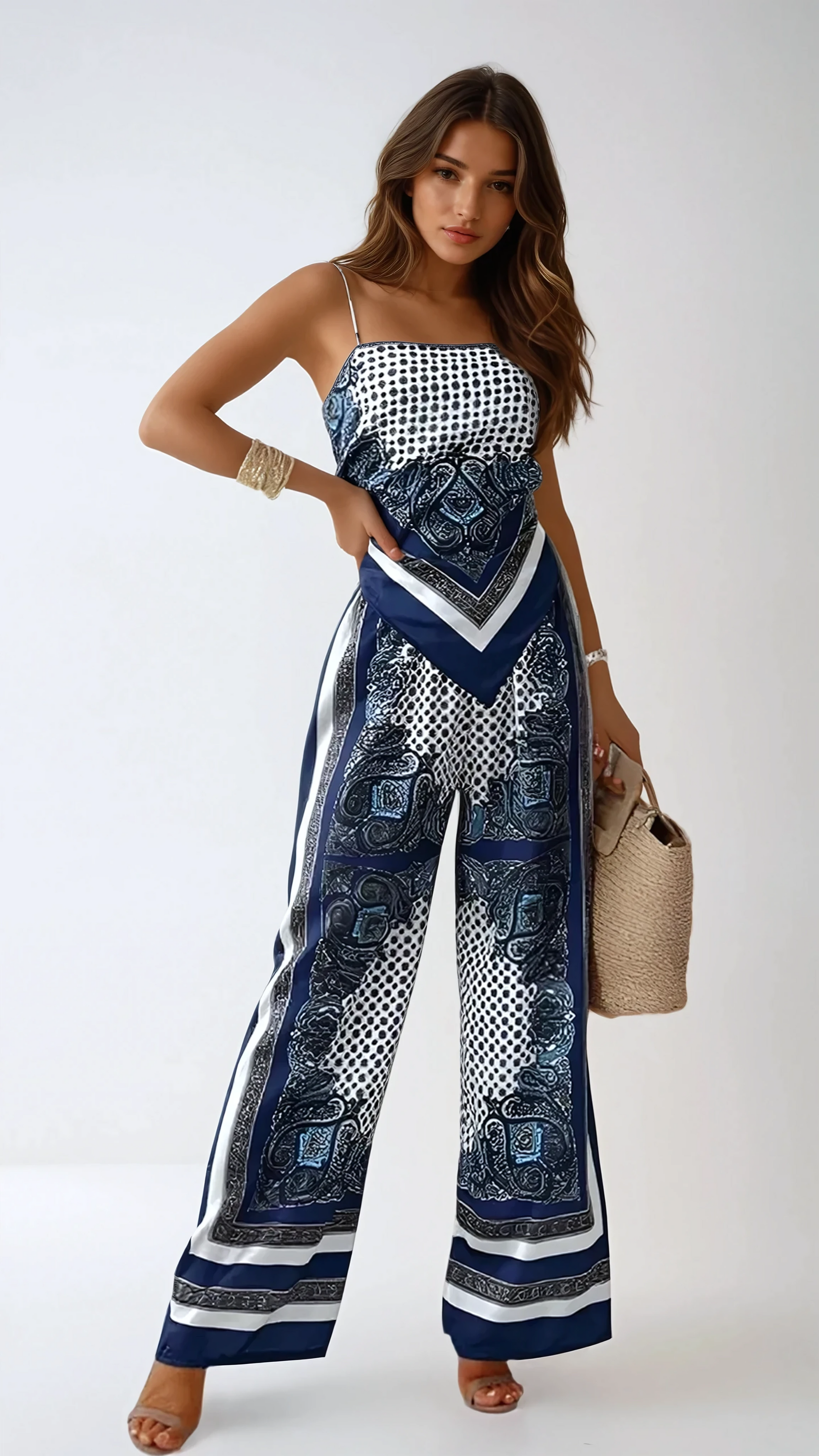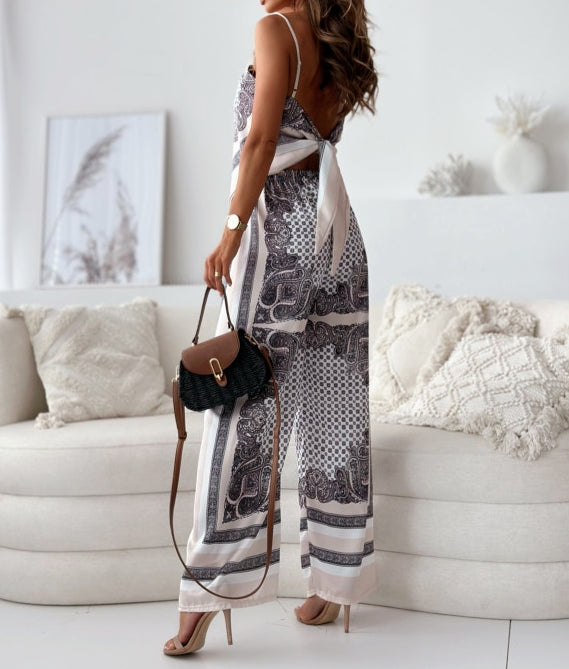 This sleeveless sling outfit with a retro pattern print is your ideal summer look. The backless top with elegant lace-up detail and the long, loose-fitting trousers create a refined, airy look. Perfect for any occasion, from casual outings to chic events. Add a touch of vintage flair to your wardrobe with this versatile ensemble.